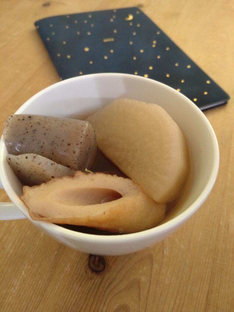 簡単おでんを作り、たまたま近くに良い器がなく、横着した私。マグカップに盛ったけど、これはこれでありやな。カップdeおでん。割賦deおでん。それはイヤ 笑。くだらんダジャレが炸裂する深夜0:20…。日付変更線越えてもうた。明日も早い。それではおやすみなさい。